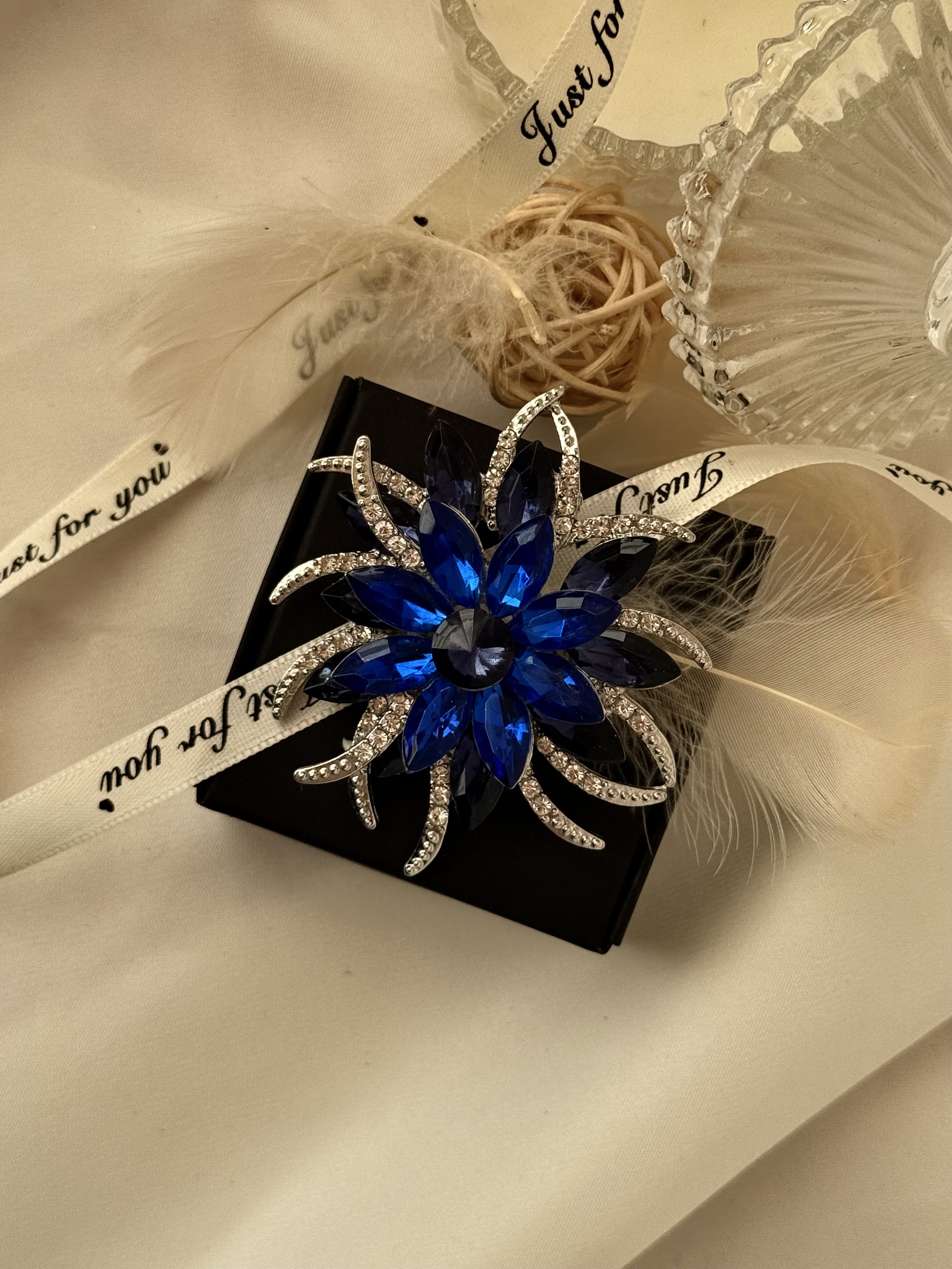 Розкішна брошка у вигляді квітки, створена з яскравих акцентів темно-синього та прозорого каміння, що зачаровує з першого погляду. Центральна частина прикраси оздоблена насиченими синіми кристалами у формі пелюсток, які блискуче відбивають світло та додають образу глибини й елегантності.
