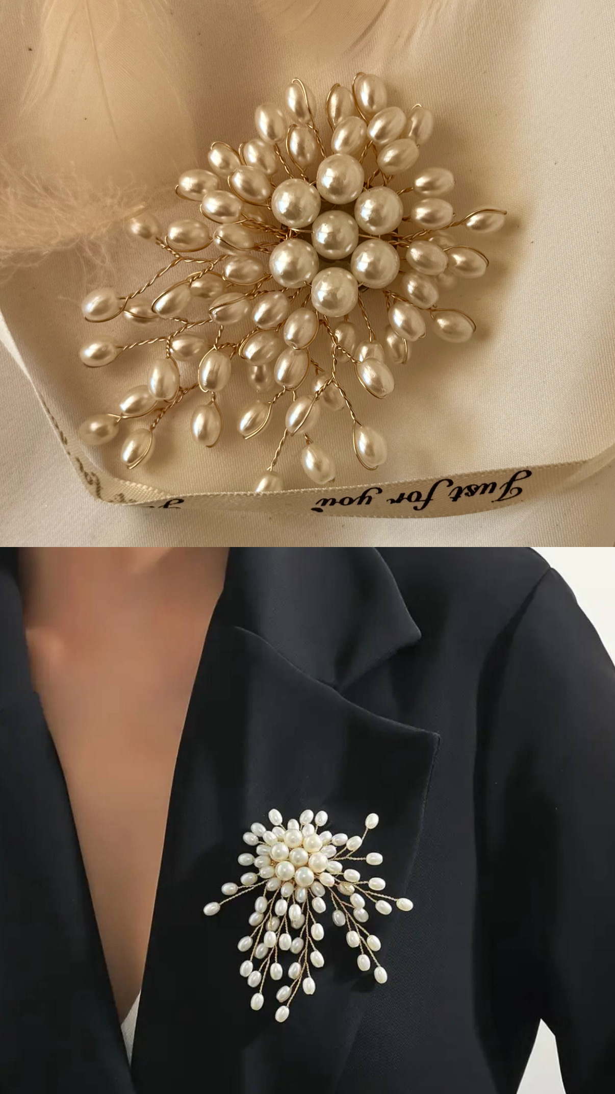 Эта брошь – изысканное и элегантное украшение, выполненное в форме цветочного ветвления. Она состоит из многочисленных искусственных жемчужин различных форм и размеров: